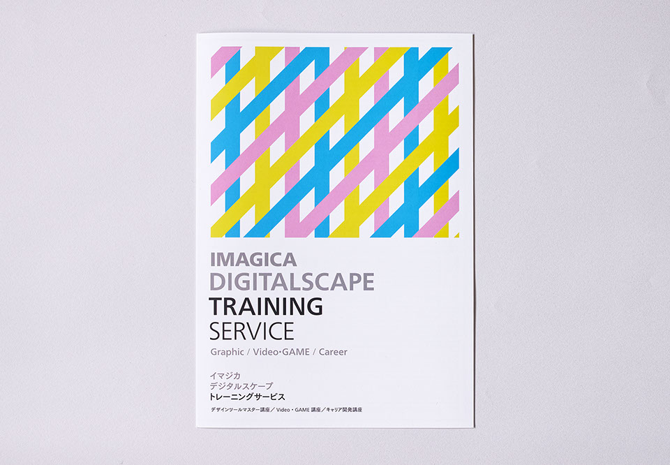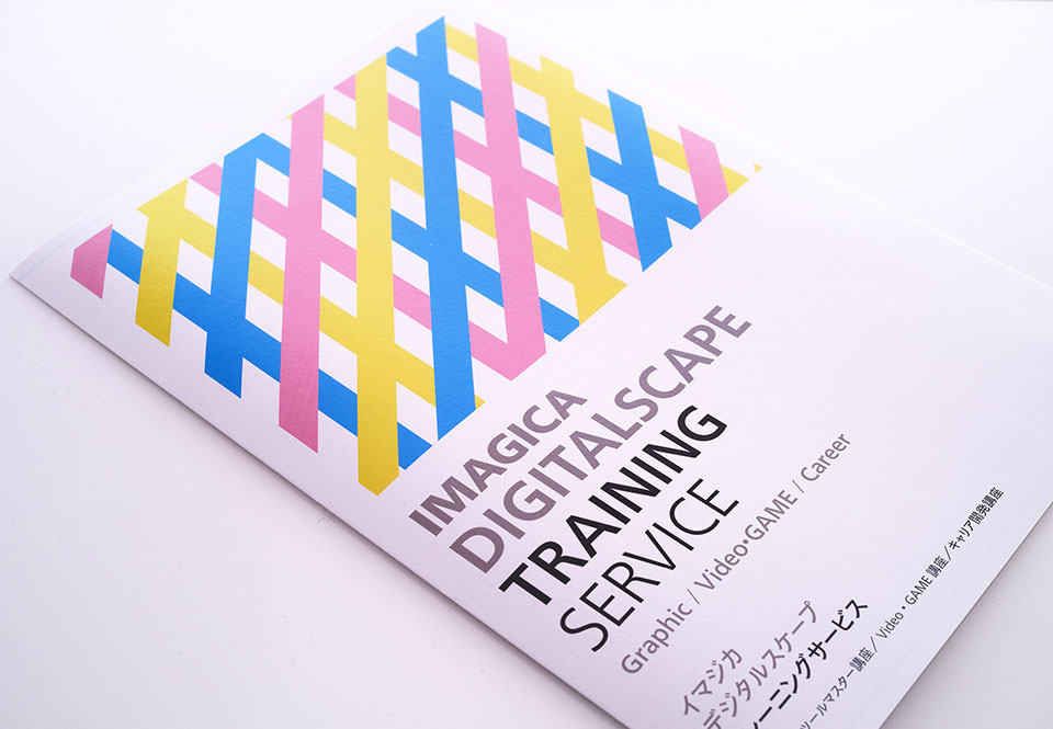 イマジカデジタルスケープのトレーニングサービスのパンフレットのデザインです。グラフィック、Web、映像の3種のスクール講座です。