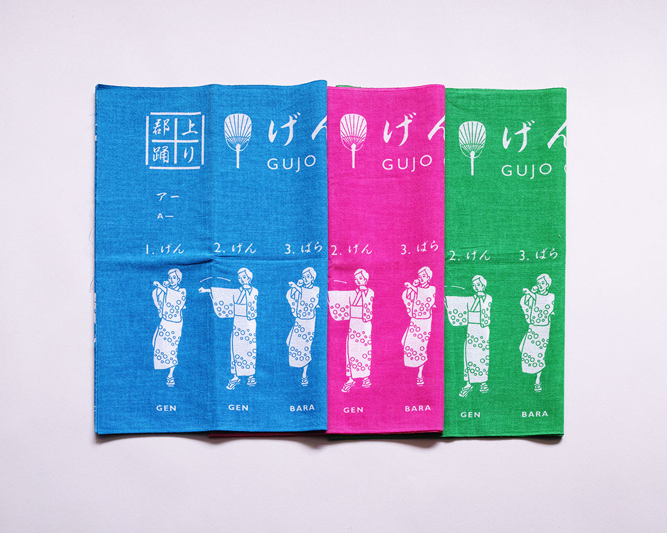 毎年岐阜県郡上市で開催されている郡上おどりの「春駒」「げんげんばらばら」それぞれの踊り方のイラストのてぬぐいです。