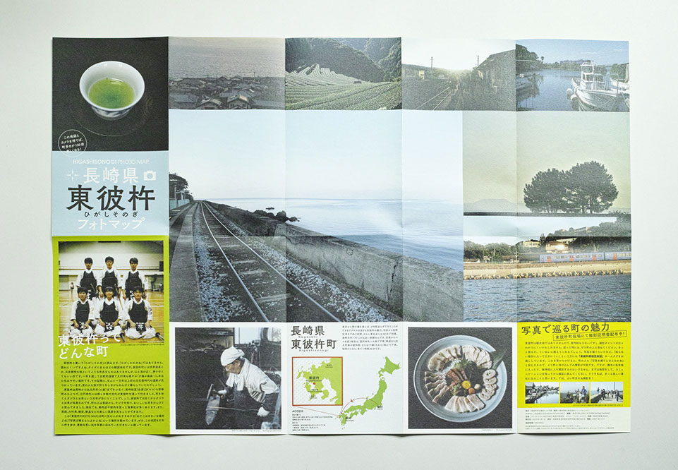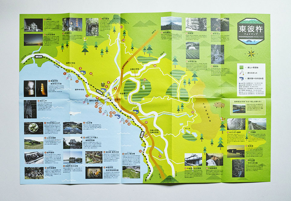 長崎県の東彼杵町の町役場に置かれている町の紹介をかねたフォトマップ。表面は東彼杵の魅力を紹介。裏面は、写真とともに町のいろいろなスポットを紹介しています。