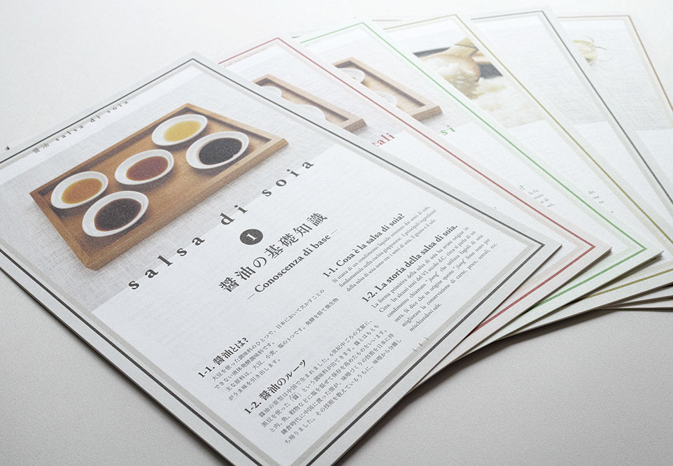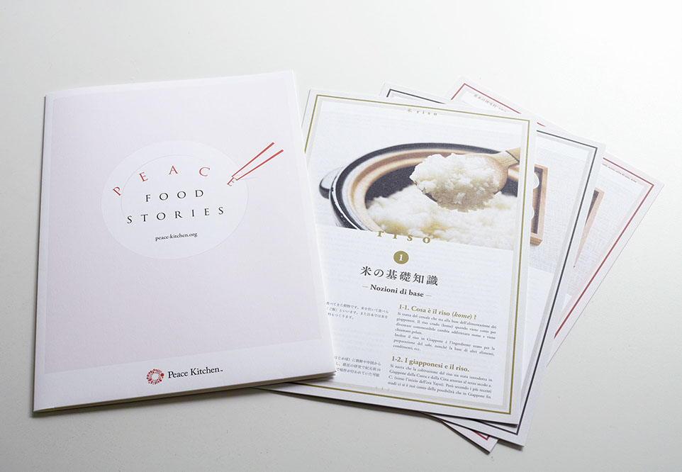 『和食を通じて、平和をつくるキッチン Peace Kitchen(ピースキッチン)』プロジェクトでのミラノ万博で和食を提案するためのレシピ集のデザインをいたしました。『味噌』『出汁』『醤油』『米』『お茶』『基本の調味料』とそれにまつわる料理を実際に現地の人達に作ってもらうためのレシピ集です。