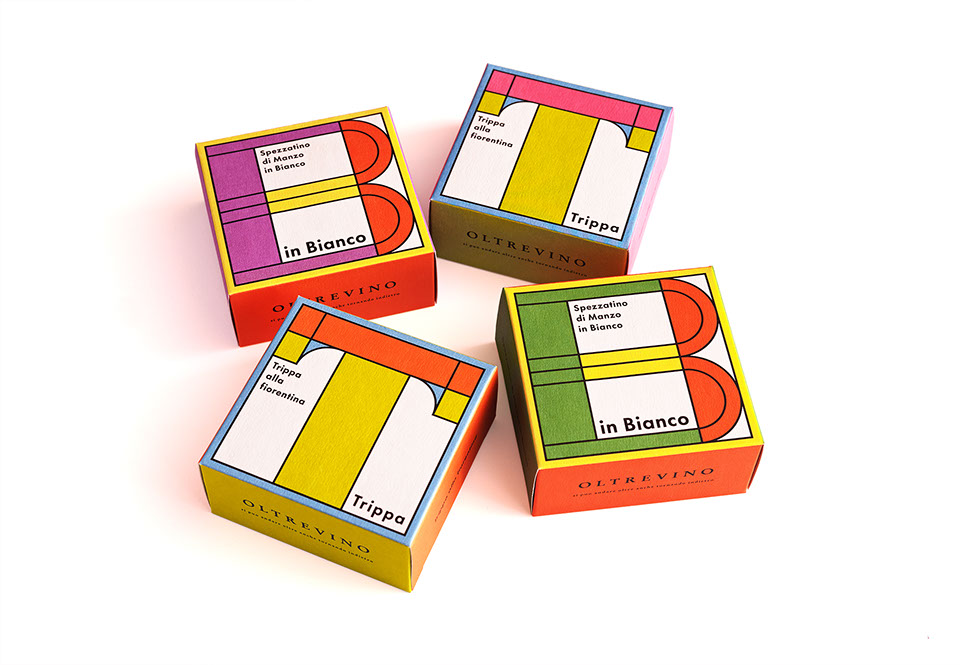 DEAN & DELUCAとOLTREVINOとのコラボレーションにて生まれた「フィレンツェ風トリッパと白インゲンの煮込み」「牛肉と香味野菜のインビアンコ」の缶詰のパッケージデザインです。トリッパ、インビアンコの頭文字をモチーフにギルトとしてもよろこばれるようなカラフルで楽しいデザインにしています。