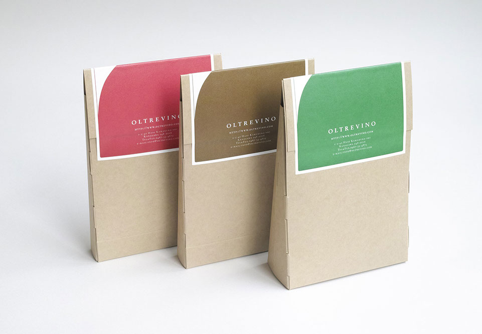 鎌倉の長谷にあるイタリア料理のお店OLTREVINOの食品のパッケージデザインです。本体パッケージの設計デザインを含めて行いました。本体のパッケージは厚さの違うソースと煮込みに対応するためオリジナルの型を作り、ソースの時は側面を薄く、煮込みの時は厚くできるようになっています。
