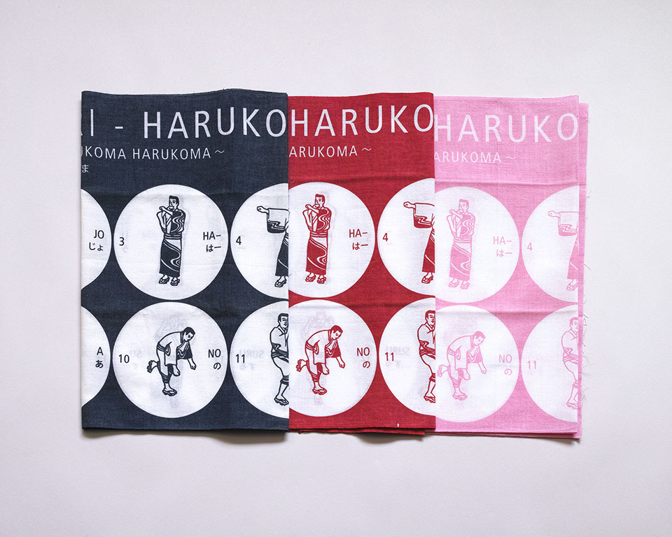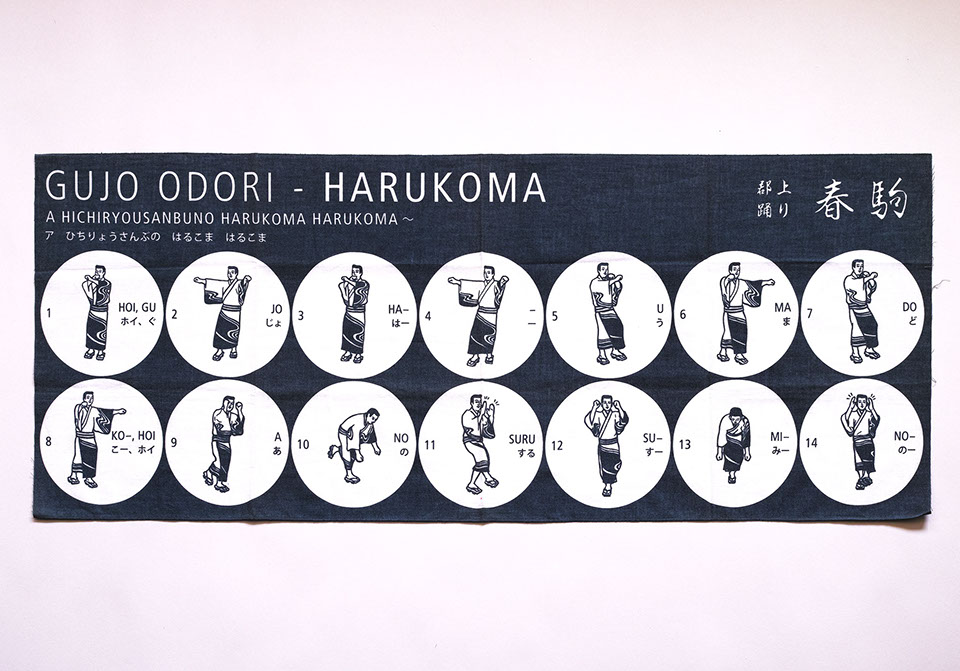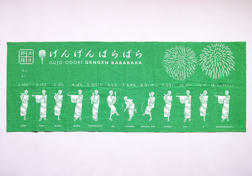 毎年岐阜県郡上市で開催されている郡上おどりの「春駒」「げんげんばらばら」それぞれの踊り方のイラストのてぬぐいです。